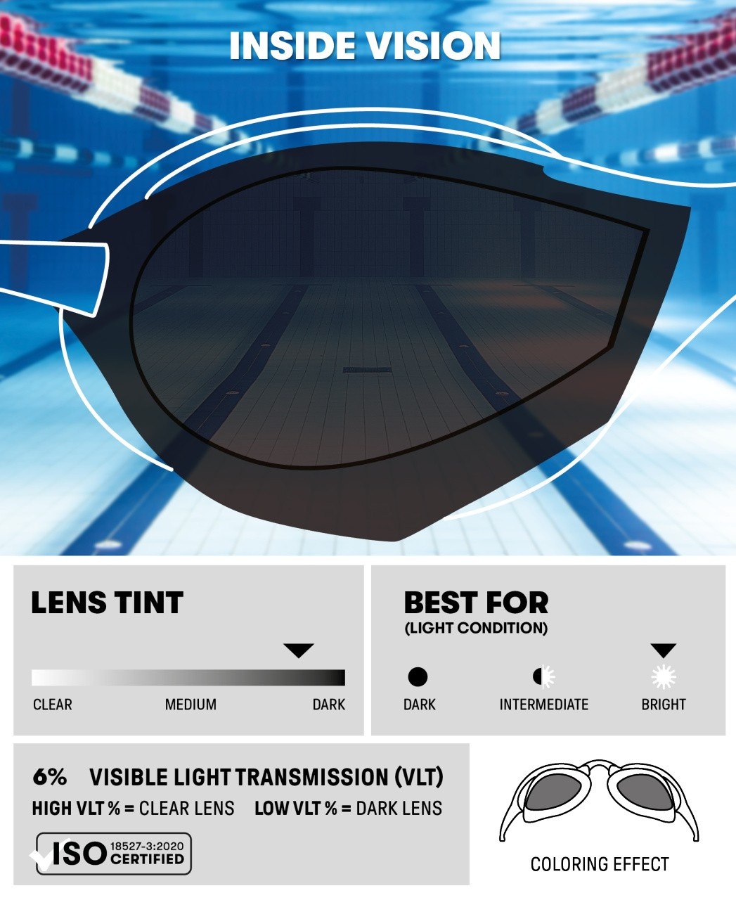 Deze zwembril van Arena is beschikbaar met medium-donkere lenzen voor alle toepassingen en variabele of middelmatige lichtomstandigheden, en donkere lenzen voor heldere omgevingen of het verminderen van helderheid. Kies je persoonlijke favoriet uit een breed scala aan getinte lenzen en montuurkleuren.