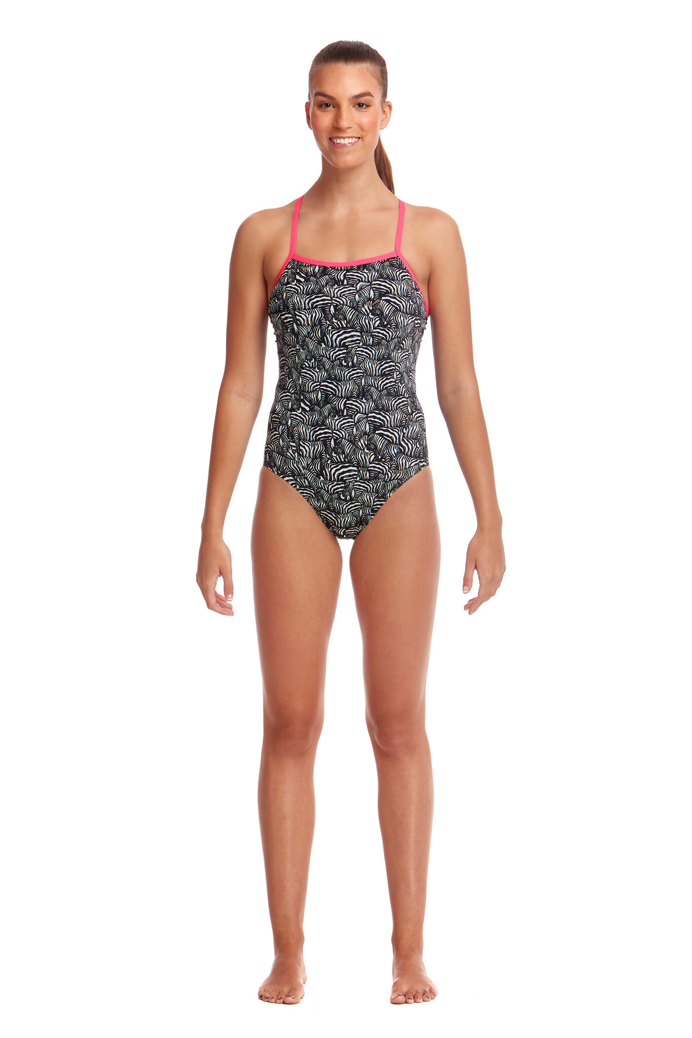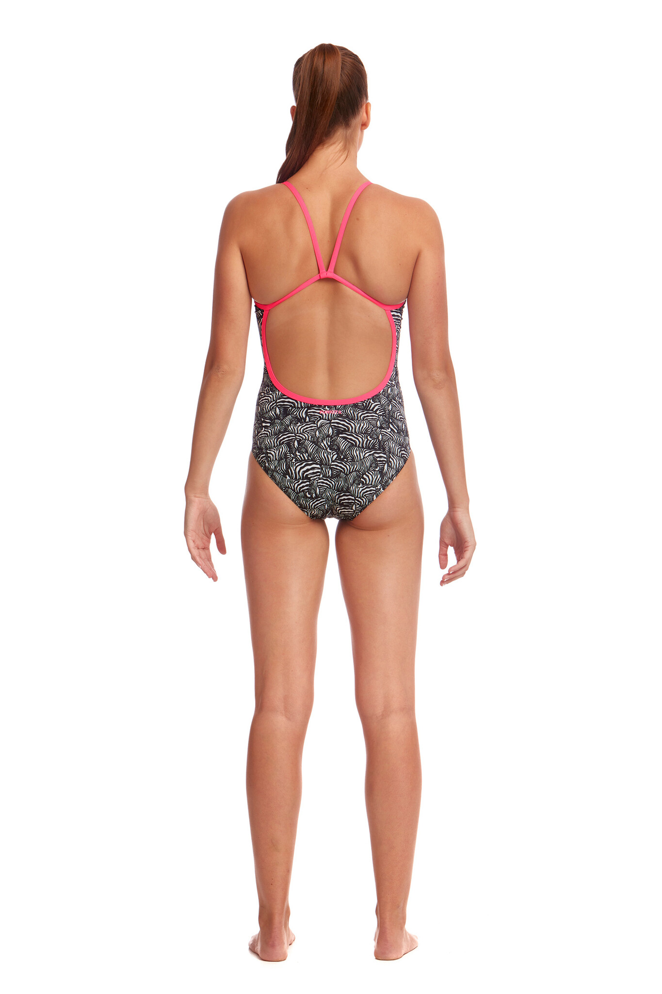 Het single strap model, de dunne schouderbandjes van Funkita, zijn hip, trendy en favoriet bij zwemmers en triathleten. Dit is niet voor niks! De dunne schouderbandjes dragen heerlijk comfortabel en het badpak sluit bij de rugzijde, schouders en billen goed aan. Door de dunne schouderbandjes heb je aan de achterzijde van het rugpand minder stof die je rug bedekt. Dit kan voor meiden en dames met een maatje minder prettig aanvoelen. Verder sluit het badpak bij de halslijn en de billen lager aan dan bijvoorbeeld bij het diamond model.