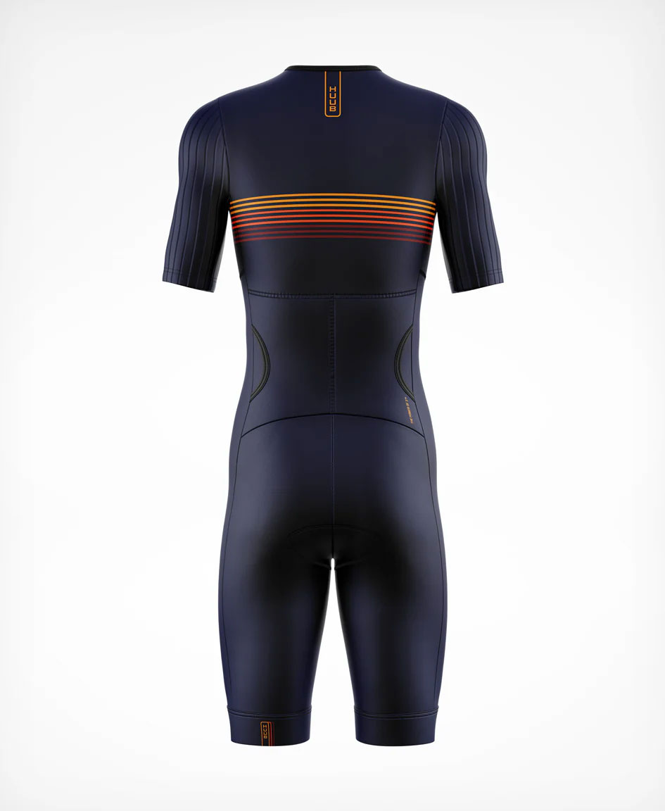 Het pak heeft ook aerodynamische zakken aan de achterkant die groot genoeg zijn voor voeding en wedstrijdbenodigdheden. De zeem is ontwikkeld op basis van jarenlange ervaring en biedt demping waar dat nodig is in de TT-positie, maar is toch minimaal zodat je niet wordt belast tijdens het hardlopen. Het pak heeft een performance pasvorm die bijdraagt aan de aerodynamische kwaliteiten van het pak, met bedrukte siliconen grippers die het pak op zijn plaats houden op de benen en gevouwen manchetten op de mouw voor een comfortabele pasvorm.