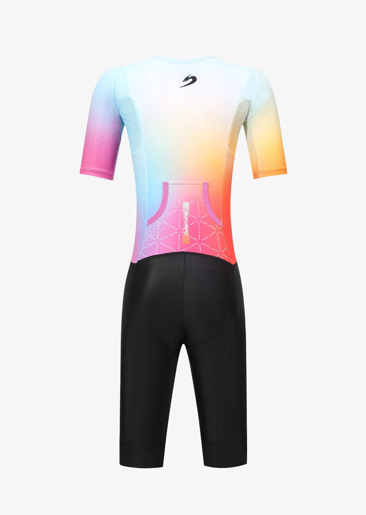 De Sumarpo Mirage trisuit voor heren is ontwikkeld voor triatleten die snelheid, comfort en ondersteuning zoeken tijdens wedstrijden en trainingen. Het trisuit combineert aerodynamische materialen met compressiepanelen zodat je efficiënt kunt zwemmen, fietsen en lopen.