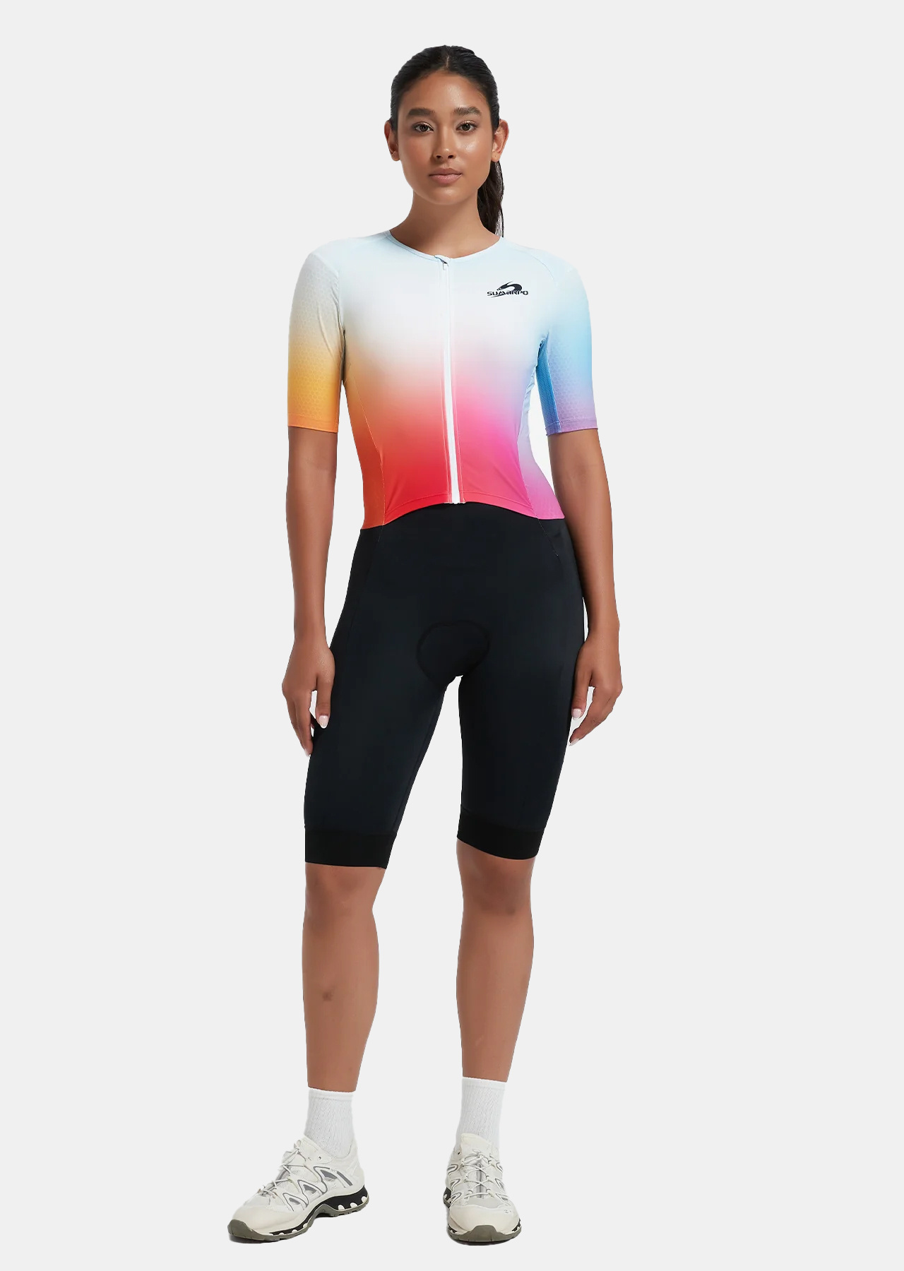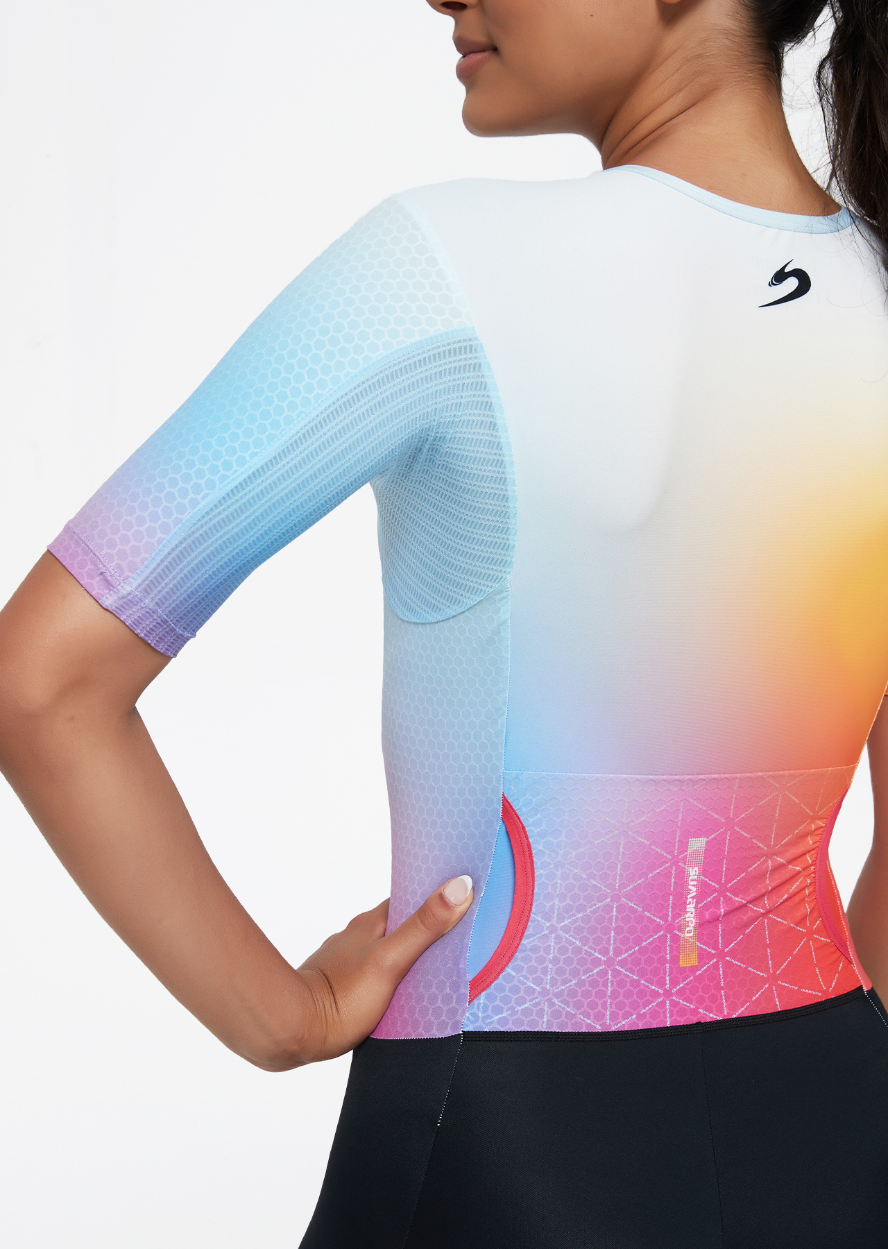 De aerodynamische mouwen en zijpanelen helpen de luchtweerstand tijdens het fietsen te verminderen. Hierdoor blijft de luchtstroom rond het lichaam efficiënter bij hogere snelheid.