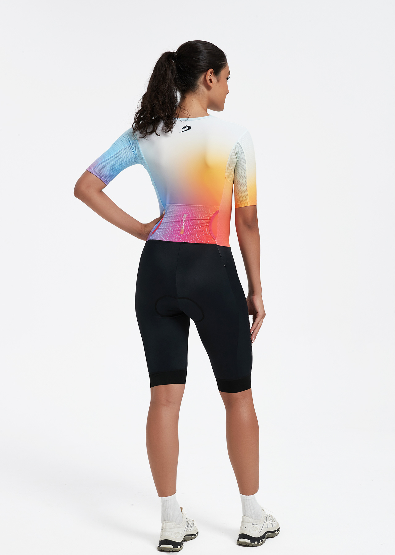 Het onderste deel van het pak is gemaakt van een compressiegerichte Italiaanse nylon-LYCRA® stof. Deze compressie ondersteunt de spieren tijdens het fietsen en lopen en helpt vermoeidheid te verminderen tijdens langere inspanningen.