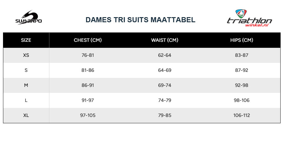 Tri suit valt op maat. Zit je tussen 2 maten in? Kies dan voor de grootste maat.